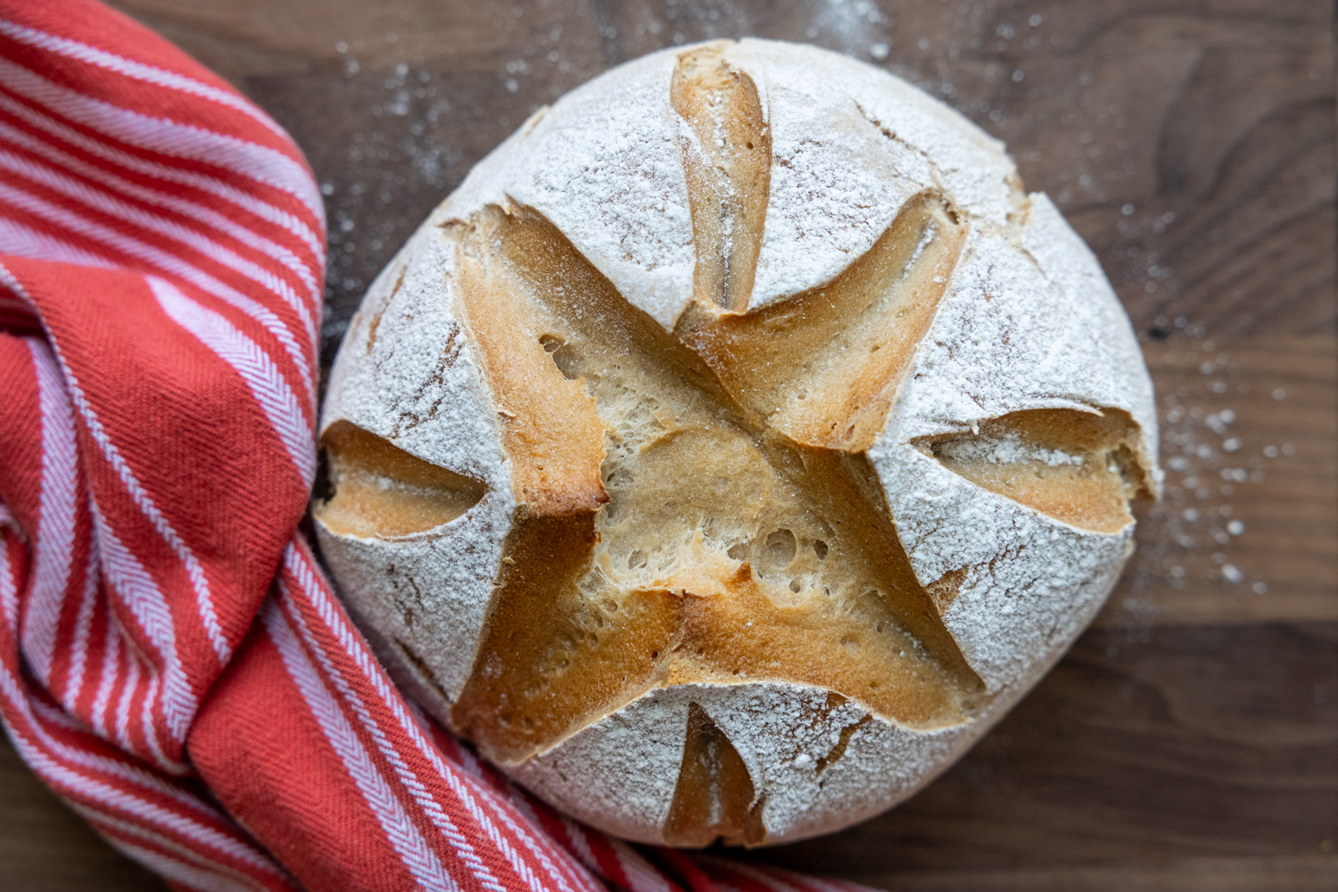 - Banneton, lame, cloche – Of these the only thing necessary for a nice crusty shell is some sort of bread cloche, but if you have a dutch oven that works just as well. I have a cast iron round baking pan with a ceramic dome to cover it. A lame can be swapped out for a sharp knife and a banneton can be a bowl lined with a large piece of parchment.